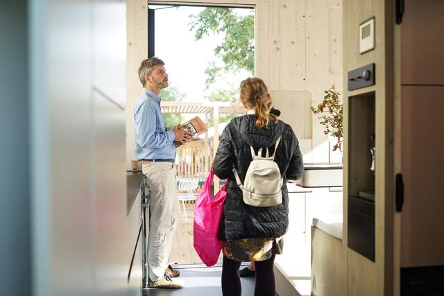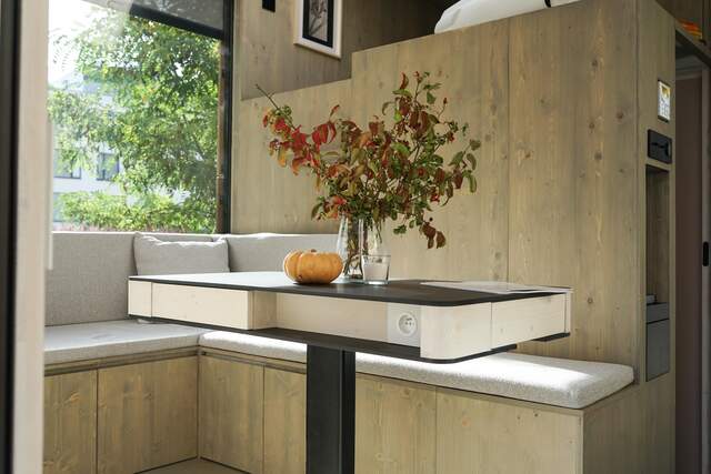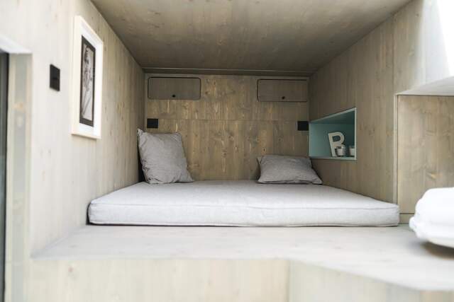 Kuchyňská linka, sprchový kout, integrovaný nábytek, úložné prostory. Do Ulity se nestěhuje, základní vybavení je její součástí. To, že se do ní podařilo vměstnat vše potřebné, je dáno každodenním praktickým testováním. Na základě toho vznikl požadavek na tři výškové úrovně podlah. Co toto řešení nabízí? Například přistýlka pro druhý pokoj je vysouvací – když není potřeba, je skrytá pod podlahou chodby. Rozdílných výšek tým Egoé využil také pro instalaci spotřebičů, získání úložných prostor či vyřešení vstupu na střešní terasu.