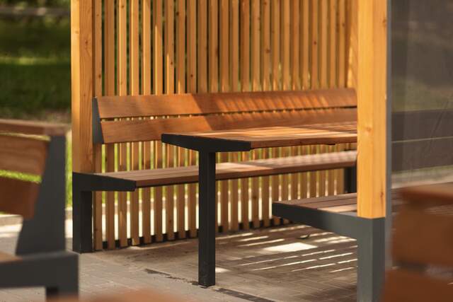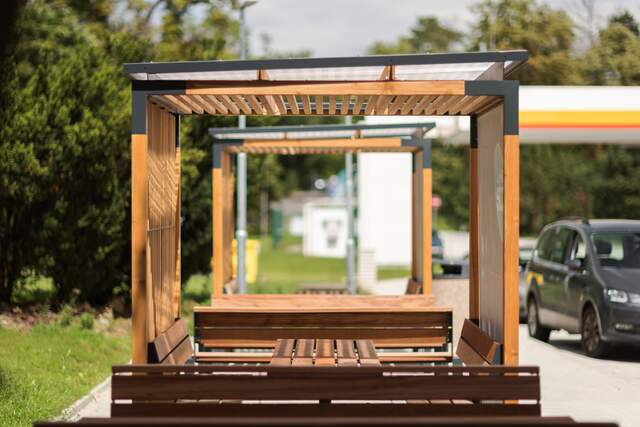 Moduly mají pevnou střechu z kvalitního polykarbonátu se zvýšenou odolností proti UV záření. Na bocích je použita kombinace lamelového roštu a bannerové plachty. Jednotlivá odpočinková místa dále doplňují prvky pro volné sezení či koše na směsný i tříděný odpad. Také ty byly navrženy a vyrobeny skupinou Egoé, která mimo jiné působí jako dodavatel zastřešení nádraží či dopravních terminálů.