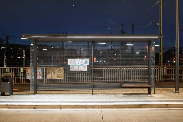Součástí přístřešků jsou i samostatně kotvené panely pro reklamní nosiče typu CLV, vývěska na jízdní řády a integrovaná lavice. O výjimečnou realizaci jde i z pohledu velikosti. Největší přístřešky, složené z pěti polí, mají délku 7 390 milimetrů. Navíc jsou oboustranné, jejich šířka v úrovni střechy tedy dosahuje 3 350 milimetrů.