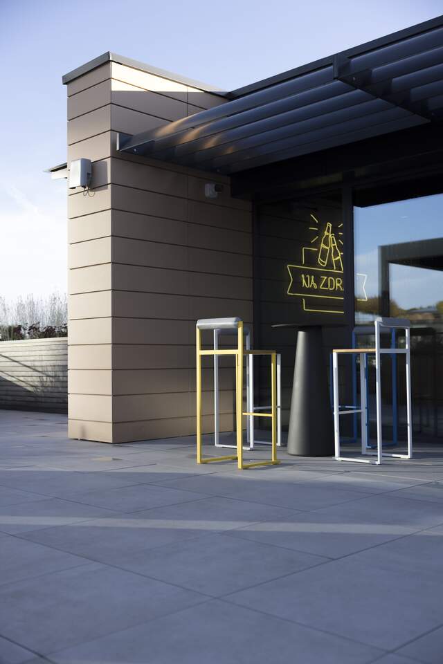 ocelová konstrukce s protikorozní ochrannou vrstvou zinku a práškovou vypalovací barvou, sedák ze dřeva, opěradlo z PUR pěny potažené outdoorovu látkou |
