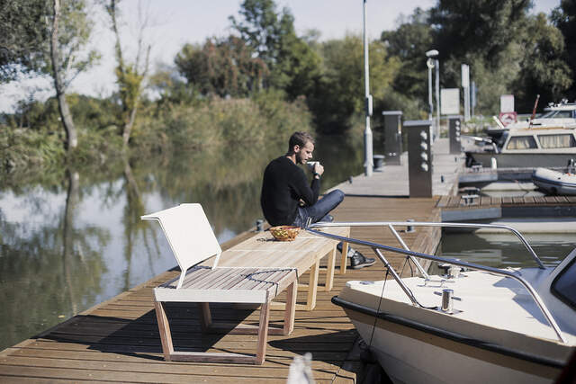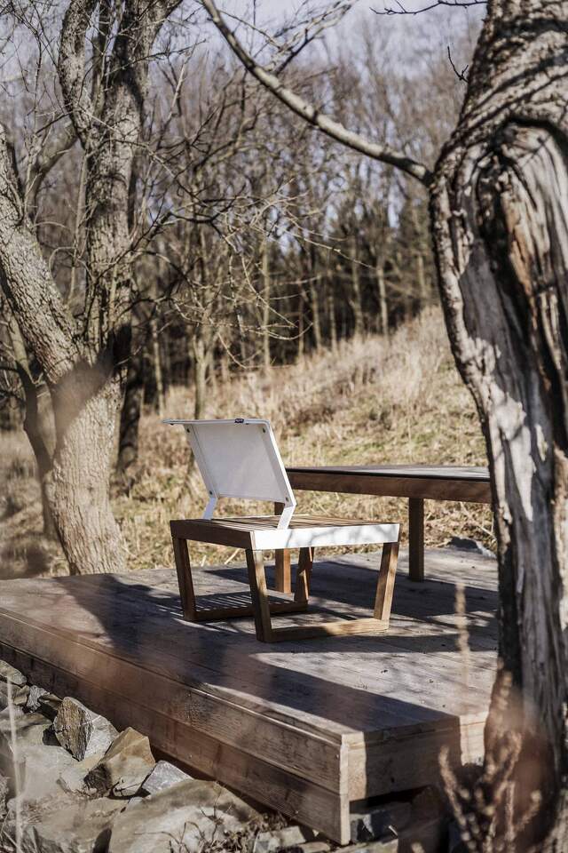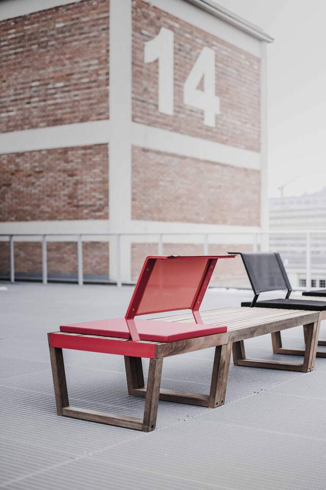 konstrukce ze dřeva, ocelové pásoviny s protikorozní ochrannou vrstvou zinku a práškovou vypalovací barvou na stranách, opěradlo z outdoorové síťoviny Batyline® |