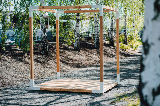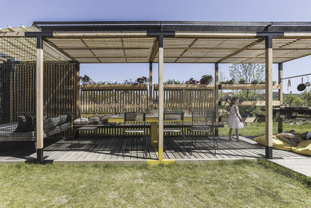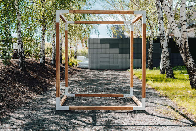 | Materiál | Konstrukce z hliníkové slitiny s práškovou vypalovací barvou, modřínové trámy, ošetřené nátěrem bezbarvého oleje. |
