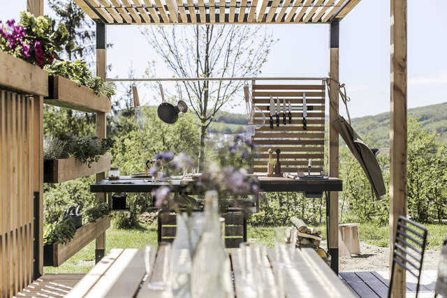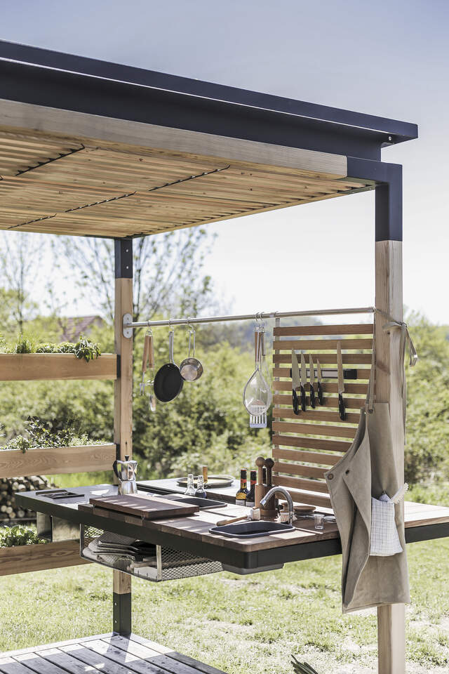 | Materiál | ocelová konstrukce s protikorozní ochrannou vrstvou zinku a práškovou vypalovací barvou, lamely z pařeného akátu, nerezové prvky. Dřevo je ošetřeno nano nátěrem bezbarvého oleje. |