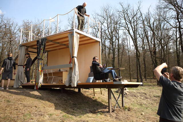 Náhodní či záměrní návštěvníci této křivoklátské zóny měli možnost přímého, mnohdy překvapivého, střetu s produkty v živelné, přírodní, napůl divoké galerii křivoklátské lesní doubravy. A nechat tak na sebe působit pocity a dojmy tímto setkáním vyvolané: „Nábytek v lese?"; „Parádní pohovka a ten výhled!!!"; „To může být venku?"; „Jééé, barevné stoličky na mechu! Jako houby po dešti". I zde mne spoza optiky fotoaparátu a displeje streamovacího mobilu doprovázela přítomnost Míši, která zde z části zastupovala i roli režisérky. Mimo moderování přenosů, provázení místních návštěv, obstarávání přenosové technologie jsme v průběhu skutečně pocítili hlubší esenci živlu ohně. Je tak skvělý.