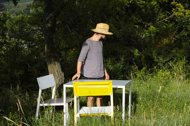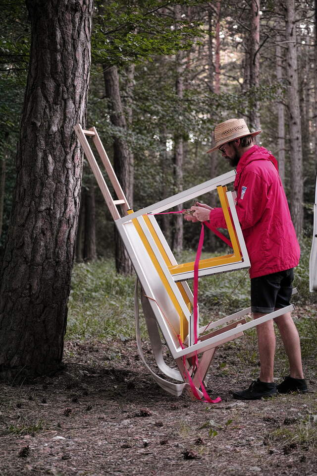 Jedinou komplikaci rozměrného nákladu představoval hustý porost. Na místo jsme dorazili v čas východu slunce. Po vysečení plácku vysoké trávy v blízkosti nevzrostlého doubku, natrhání kytice a ustavení mobiliáře jsme společně zasedli ke stolu. Provoz této vyhlídky jsme začali snídaní o čaji z čerstvě natrhané dobromysle a koláčcích od babky z Huslenek. Vychutnávajíc si ranní slunce při snídani s výhledy jsme se shodli, že místo musíme zažít i při západu. A tak se i stalo. Ke společnému stolu jsme pozvali místního sochaře a jeho rodinku, který nám místo ukázal. Zasedli jsme ke stolu podruhé. S číšemi vína připíjíme na zdraví a krásný večer. Pak už jen v tichém obdivu sledujeme okolí zalité teplým světlem zapadajícího slunce. Pohled to byl vskutku čarovný.