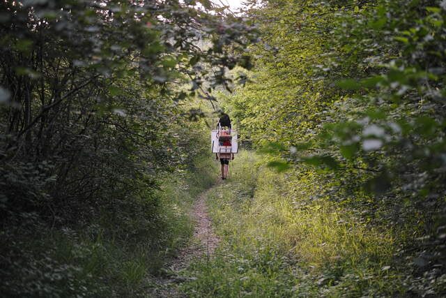 Dle domorodého umělce má i historicko-strategický význam a právě proto jsme ji nazvali "Strážná hůrka". Dřevěná nosítka jsme tentokrát naložili sestavou jednoho stolu a dvou židlí. Váhově byl náklad více než o polovinu lehčí než předchozí, takže vlastně pohodička. Měl své specifikum v prostorové rozměrnosti. Na nenáročné cestě k objevenému místu, byl tedy prostor a síla i na pózování fotografce Míši.