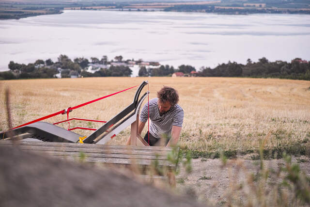 Ze série vyhlídek je tato trasa nejdelší, okolo 2 km. Délka byla další nová výzva pro mne jako nosiče. U kapličky na okraji Pavlova s výhledem na vodní plochu Nových Mlýnů jsme rozbalili základní tábor pro naložení nosítek. Dvě rozměrná lehátka a malý kruhový stolík vážily cca 38 kilo. Se zkušeností vysokohorského šerpy nahazuji nosítka na záda a vyrážíme.