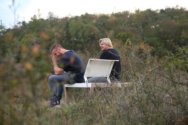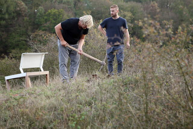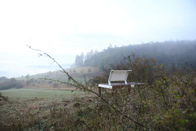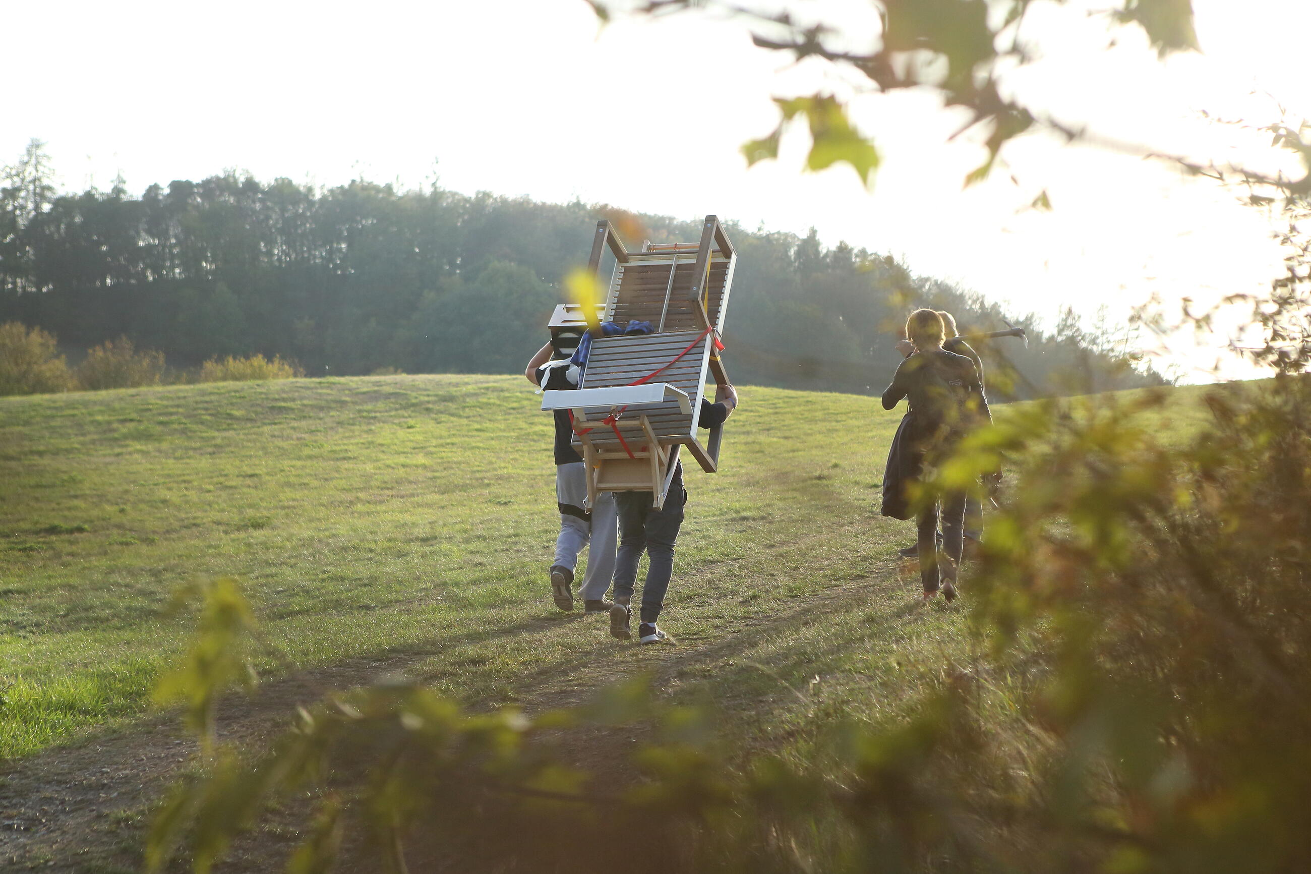 Od slov k činu neuběhlo mnoho dní. V podzimním prosluněném křivoklátském ránu jsme setkali vzájemně své nálady a přivítali se s dalšími “hosty”, rozespalým Radkovým synem Vaškem a jeho kamarádem Lukášem. Oba chlapi jako hory. Dvougenerační výprava čtyř mužů v doprovodu fotografující ženy pochodovala vstříc zdejším lesům s jasným záměrem společně nalézt vhodné místo v krajině, kde by instalované zahradní posezení souznělo s prostorem, vzbuzovalo pozornost kolemjdoucích i nutkání spočinout.