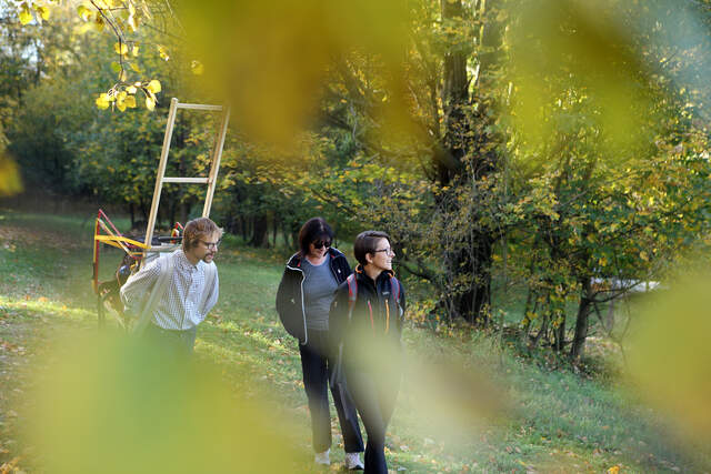 Odměna za fyzický výkon přišla ve chvílí za horizont zapadajícího slunce, kdy již zpět na místě instalované Vyhlídky si tento moment Míša plně vychutnávala s fotoaparátem v ruce ve společnosti první vyhlídkové návštěvy dvou žen, maminky a dcery z nedaleké vesničky. S nimiž jsme na druhý den ráno společně nalezli další polohu, takzvanou “východní”. Přirozeně tak vznikla instalace větší rozlohy. Dvě místa na dohled od sebe. Pracovně Vyhlídka Horečky ZÁPAD a VÝCHOD. Z Vyhlídky vede pěšina svahem dolů přes les k malinké osadě se zvířaty různých druhů (mini-zoo). Od jejichž pečovatele jsme si zakoupili domácí vajíčka místních horečských slepic a uzavřeli okruh kolem místního hostince U Janíka, hotelu Vlčina, venkovního amfiteátru zpět u zvoničky Stražkyně Beskyd na Horečkách.