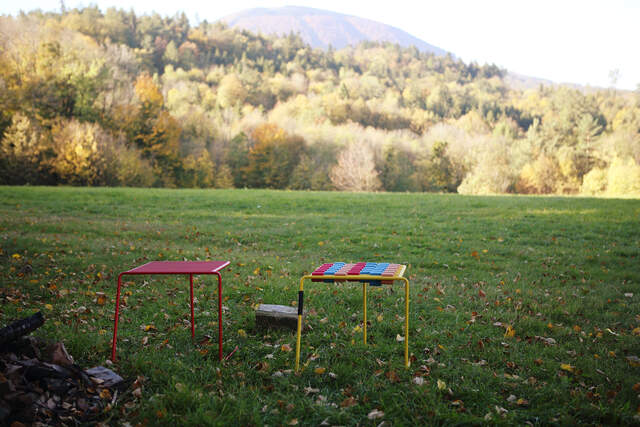 Vedení Petrou, z naší nevelké skupinky, člověkem nejdéle spjatým se zdejšími malými horami - Horečkami, pochodujeme lesní pěšinou. Nenáročným terénem vystlaným padajícím listím přicházíme k ohništi pod mocným dubem. “Tak, to je to místo” řekla Petra. Vyhlédli jsme na horu hory Velký Javorník a v úžasu na sebe s Míšou pokývli, “nádhera”. Jakoby se ohniště a dub staly symboly beskydských Vyhlídek. Společně vykládáme a instalujeme stoličky Tina na plácku chráněném silnými větvemi mnohaletého dubu. Jako načrtlé tenoučkým fixem syté barvy na pozadí krajiny zemitých odstínů upoutávají stoličky pozornost akcentem neměnných jarních a letních barev. Instalací naše cesta ovšem nekončí. Skvostný výhled na prosluněný Velký Javorník byl neodkladnou výzvou jeho zdolání. Bez zahálení zahajujeme provoz vyhlídky výšlapem z Horečky na Horu.