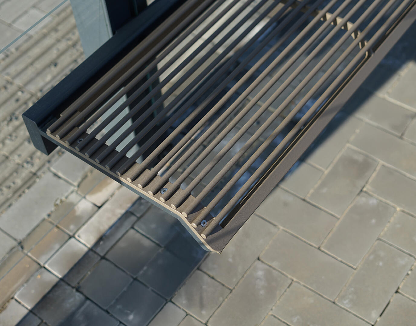 X2 - Přístřešek pro kola dál rozvíjí hru s úhly – nezaměnitelný charakter celku podporují sklon stojanů a lomená spodní hrana boční výplně. Ochranu před počasím zvyšuje oboustranný přesah střechy.