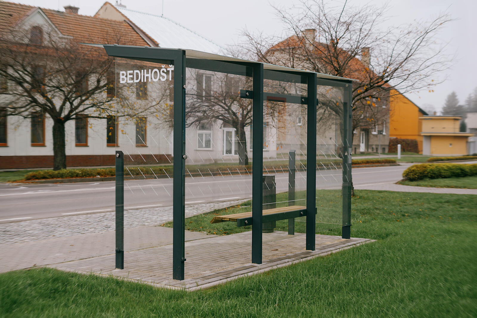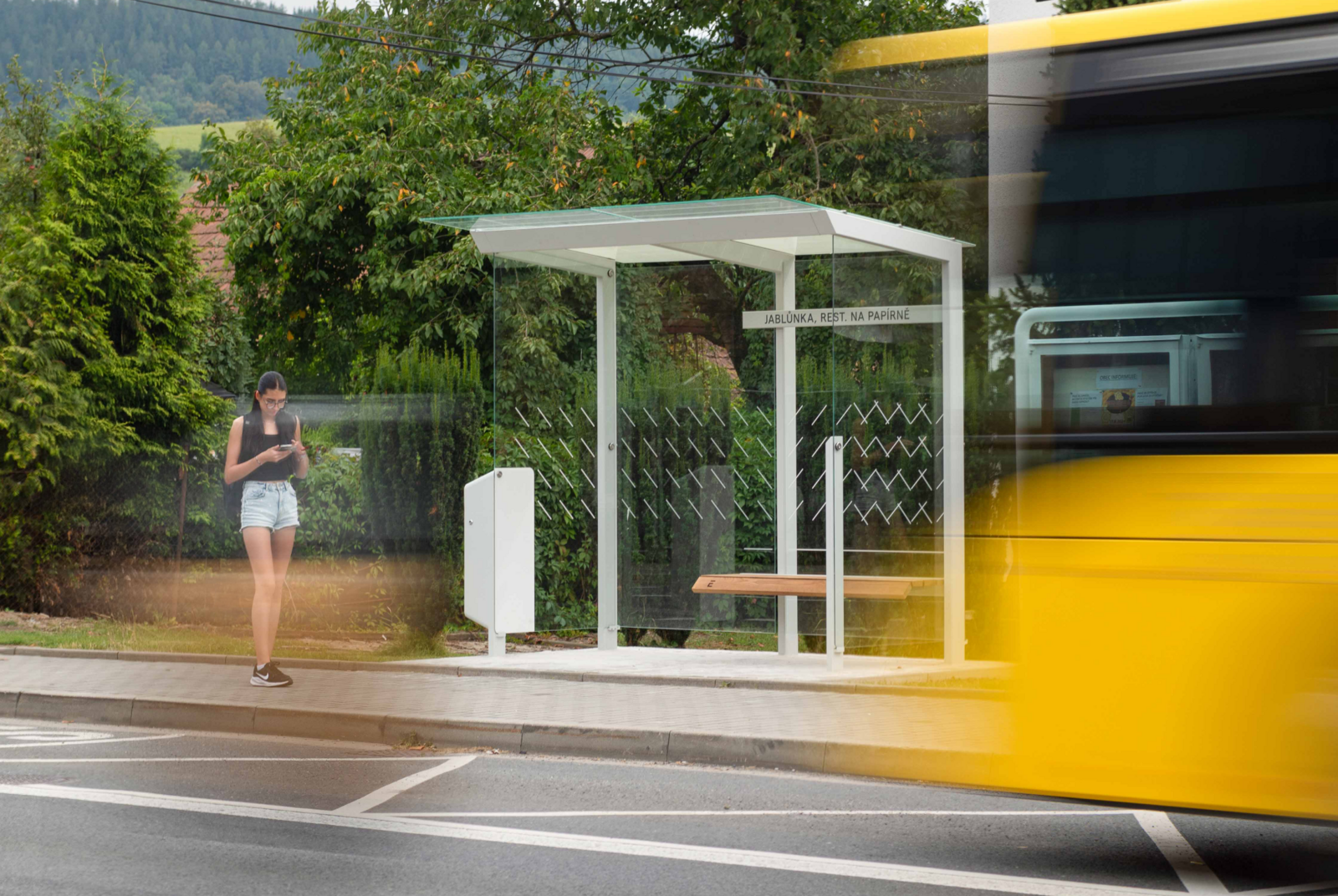 X2 - Zastávkový přístřešek, který je na první pohled rozpoznatelný díky opakujícímu se prvku – zešikmení pod úhlem 45 stupňů. Skleněné tabule na střeše a bocích mohou nést grafické prvky.