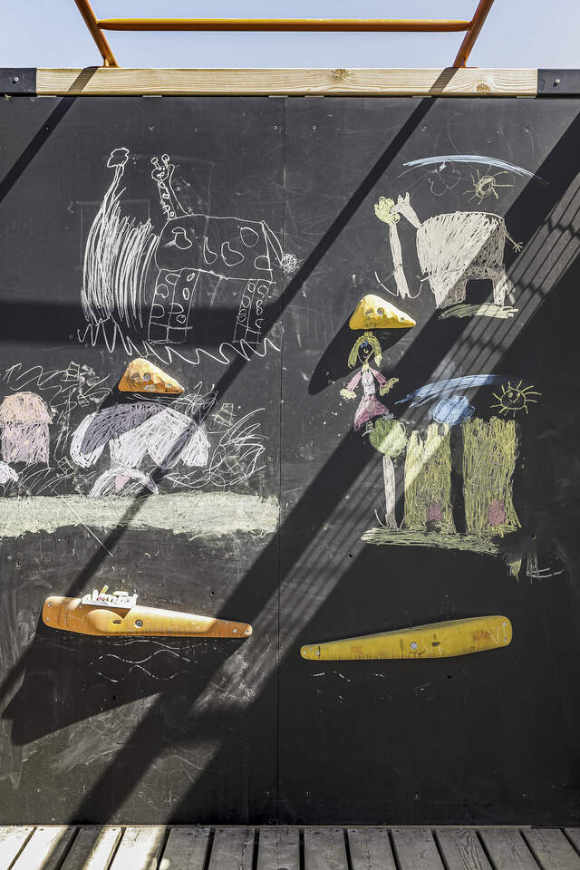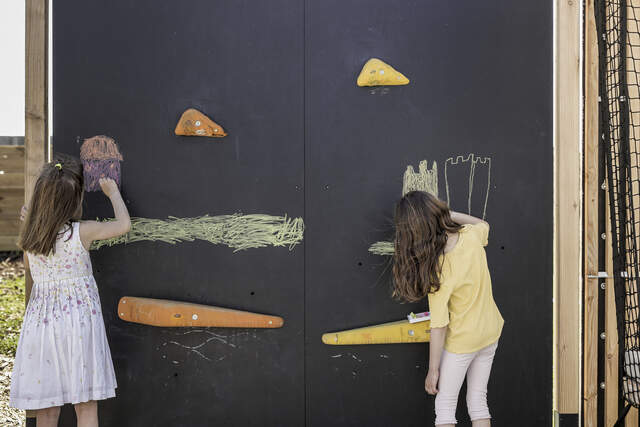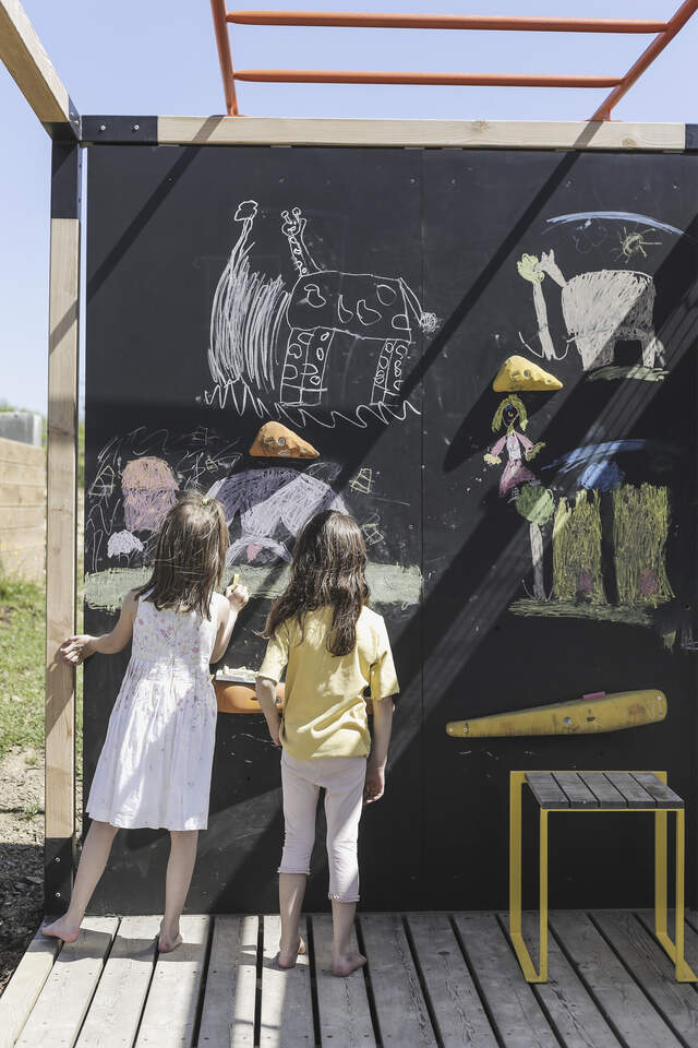 Rost aus Lärchenholz, behandelt mit farblosem Nano-Öl, beidseitig mit Tafelfarbe beschichtetes Outdoor-Sperrholz, 3 Klettergriffe auf einer Seite