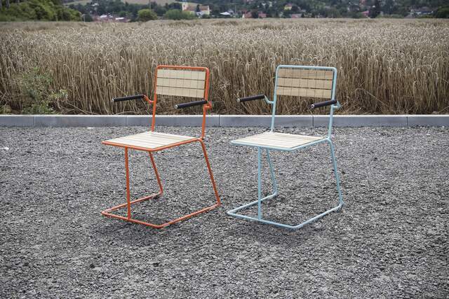 Stahlkonstruktion zink- und pulverbeschichtet, Sitz und Rückenlehne aus Holz, Armlehnen mit Velcro bezogen