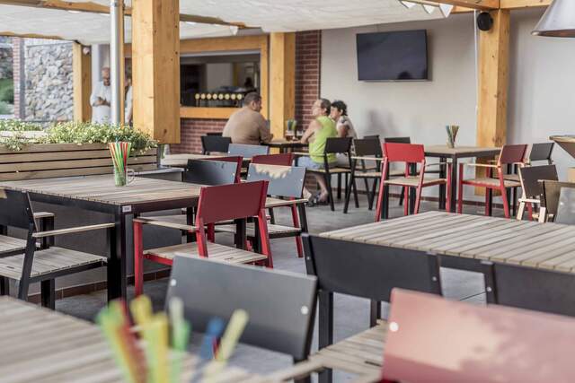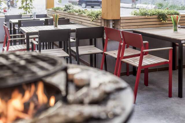 Powder-coated aluminum alloy structure, seat made of wood, optionally treated with oil, backrest made of high pressure laminate (HPL)