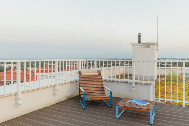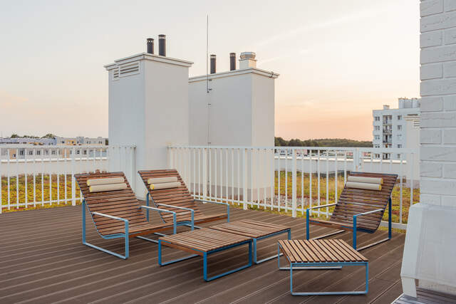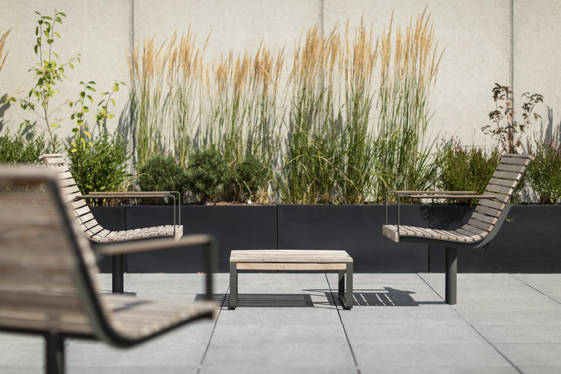 Steel structure with protective zinc coating and powder coating, solid wood with optional oil application