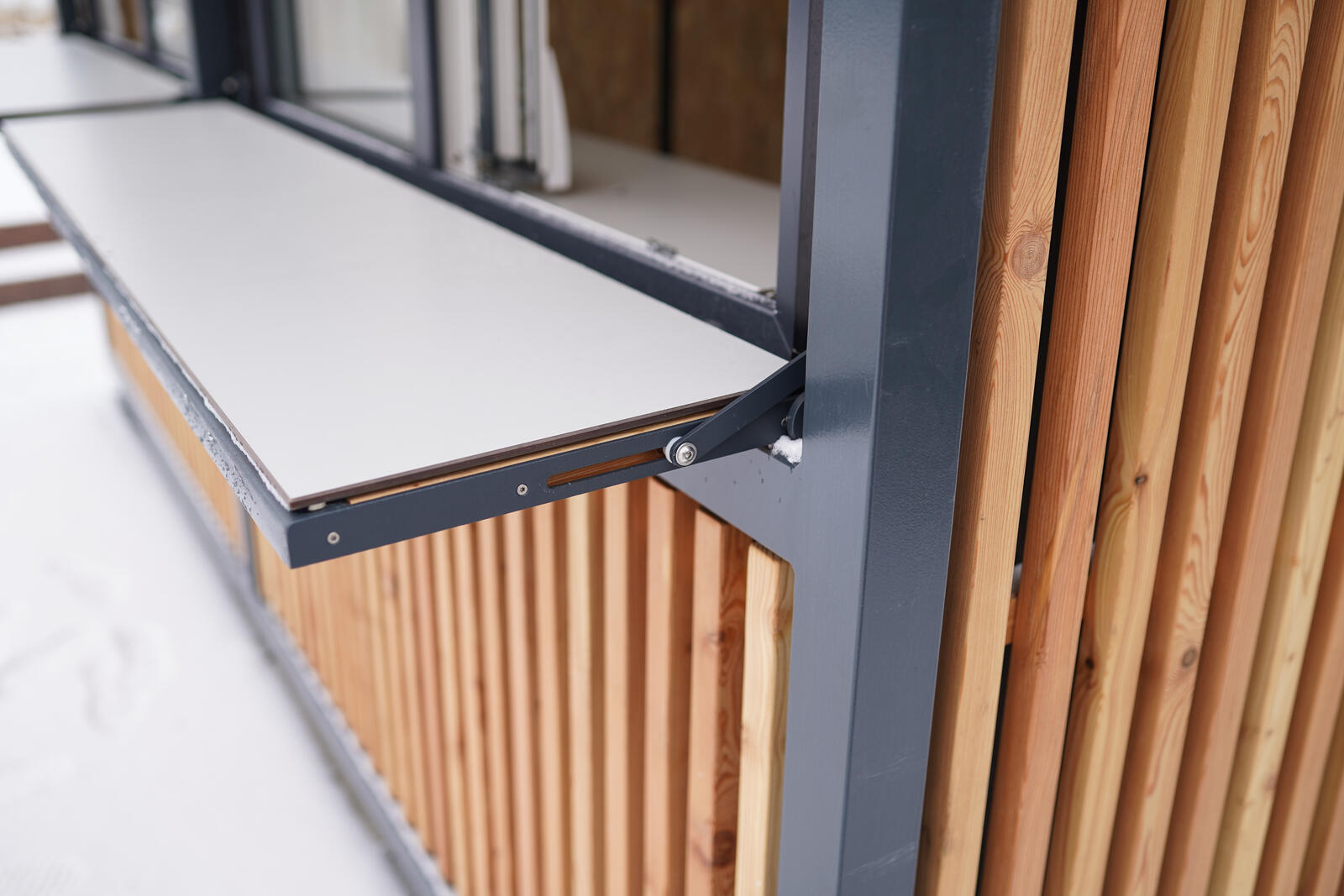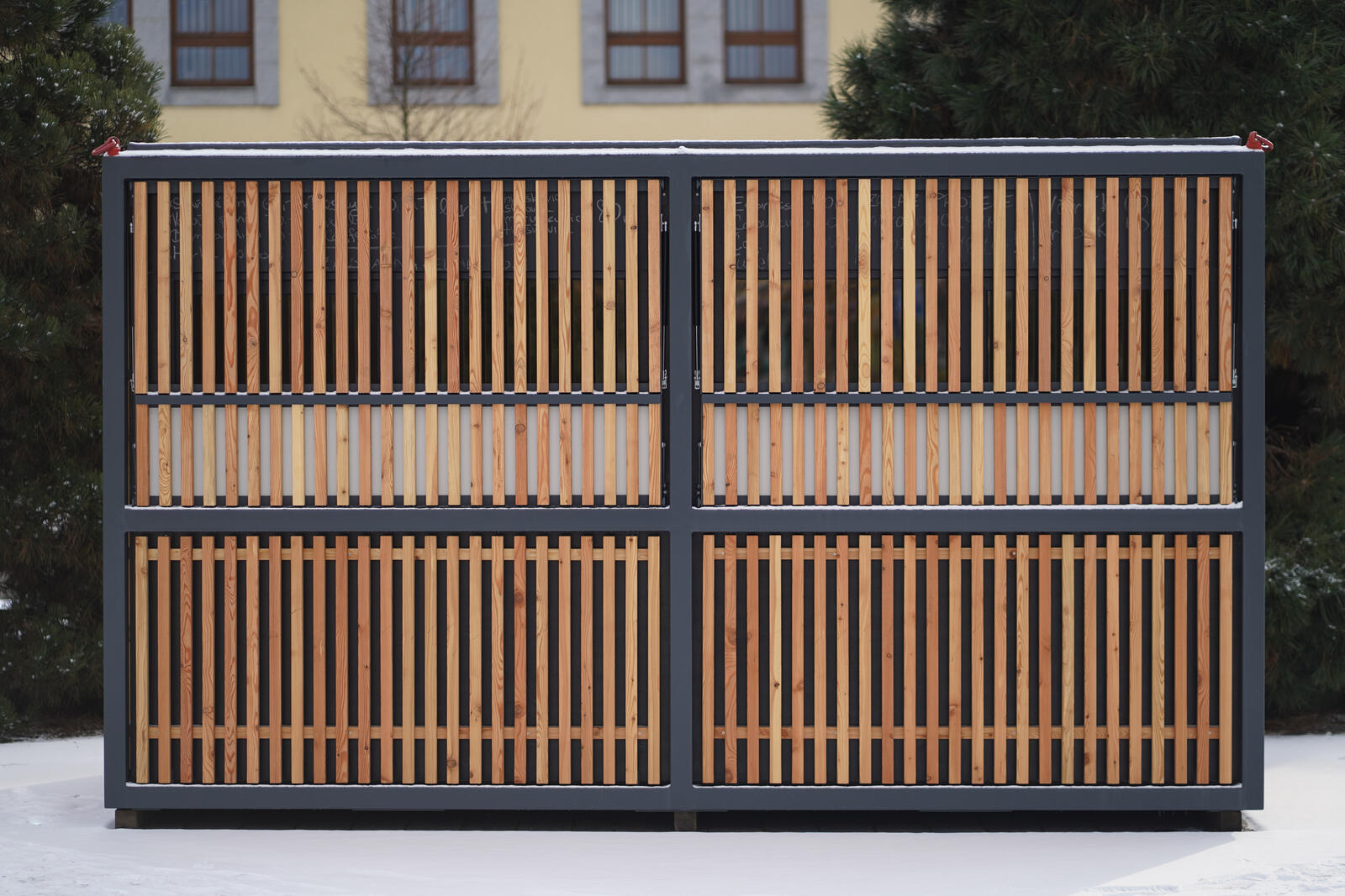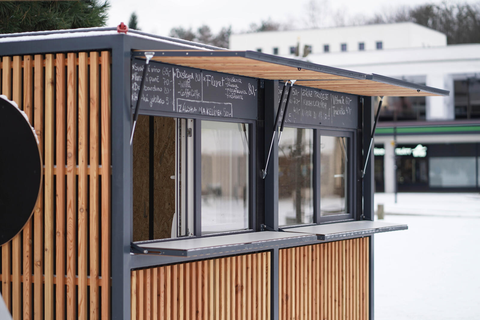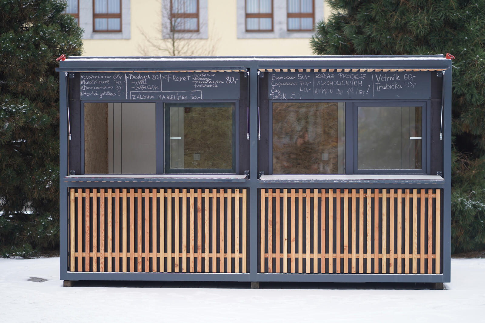 The base is made of two cubes forming a solid welded block with a rectangular plan. On the upper edge there are transport lugs. The walls are made of waterproof plywood, the facade is made of slatted grid. The dispensing window is fitted with a hinged counter and a screen that can be locked together when closed.