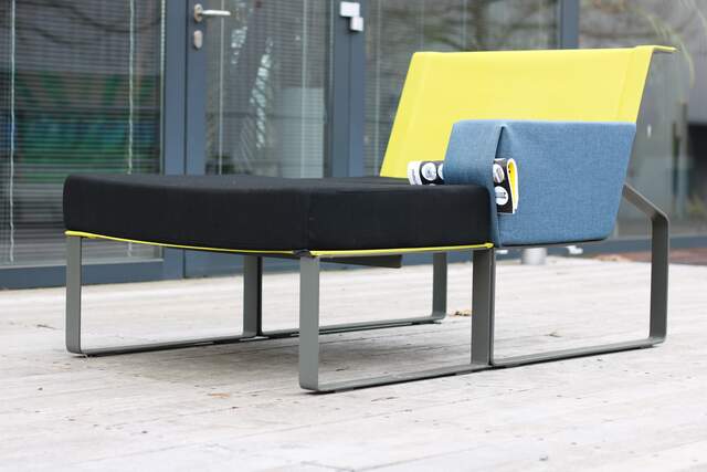 Steel structure with protective zinc coating and powder coating, seat made of outdoor foam Dryfeel® covered with water-resistant outdoor fabric, backrest made of Batyline®