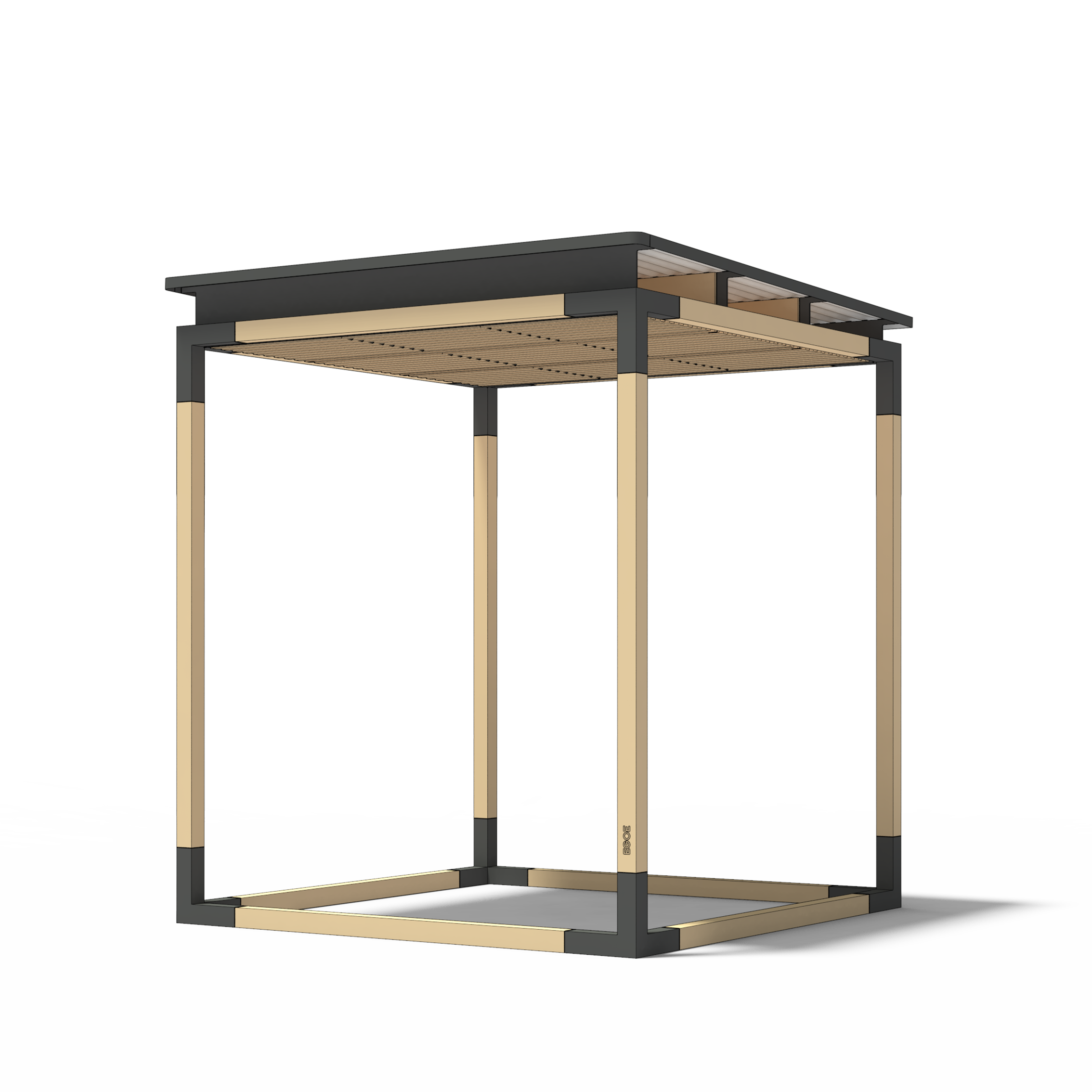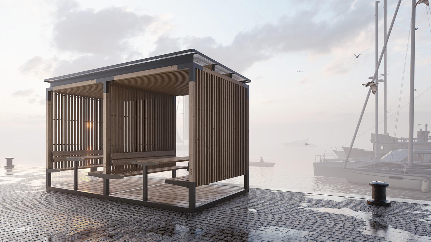 steel structure with corrosion protection zinc coating and powder coating, larch boards and slats, polycarbonate. The wood is treated with a nano-coating of colourless oil.