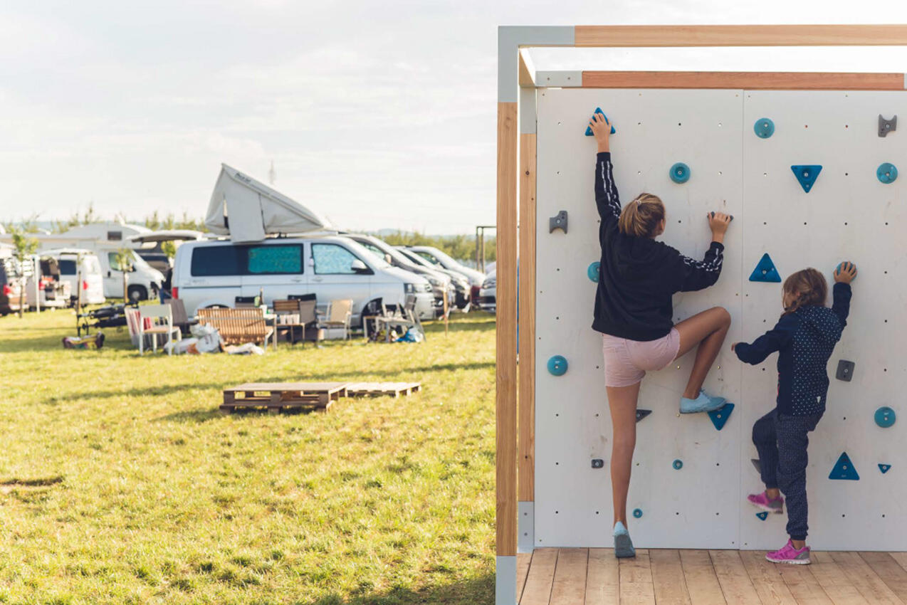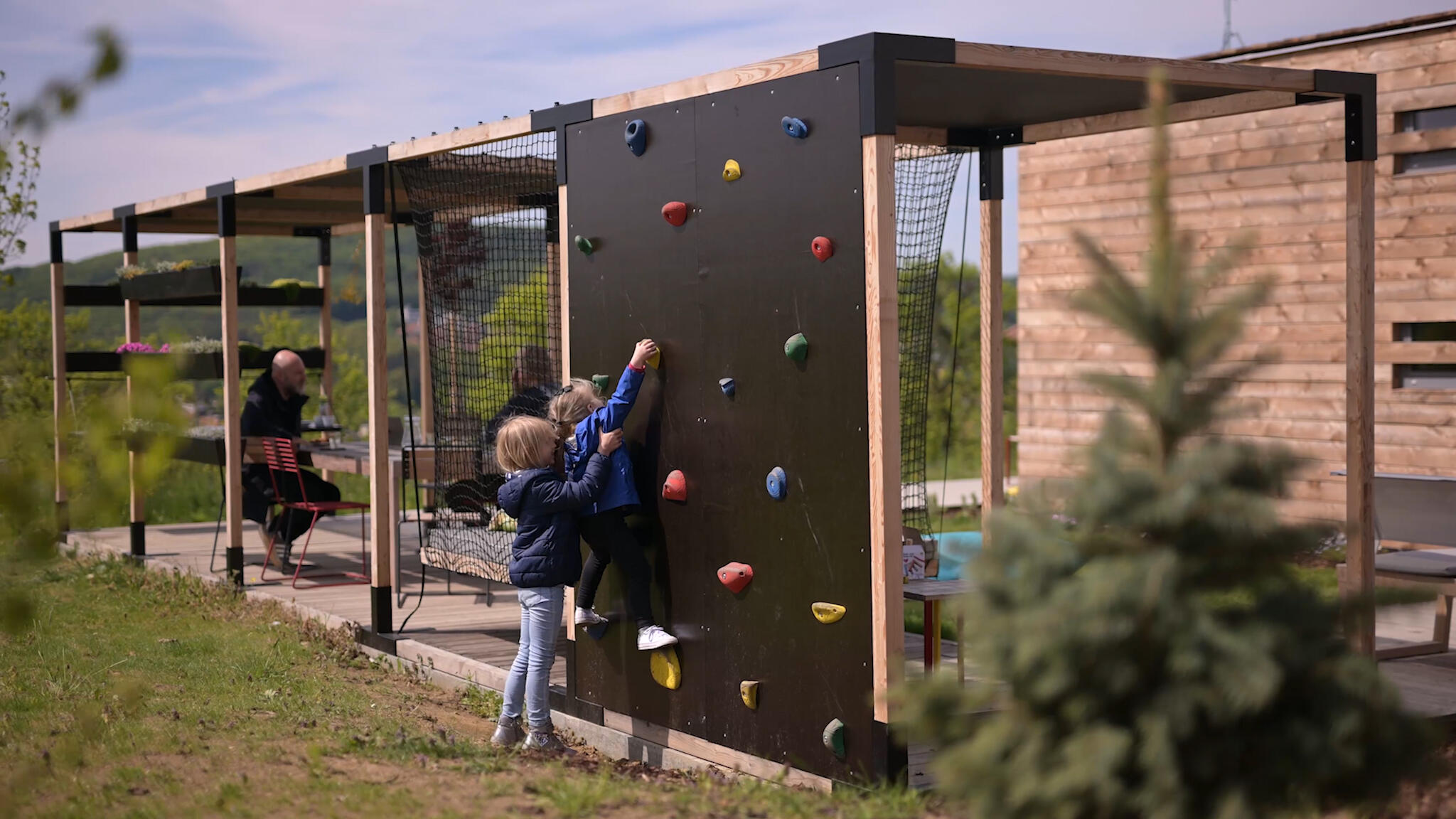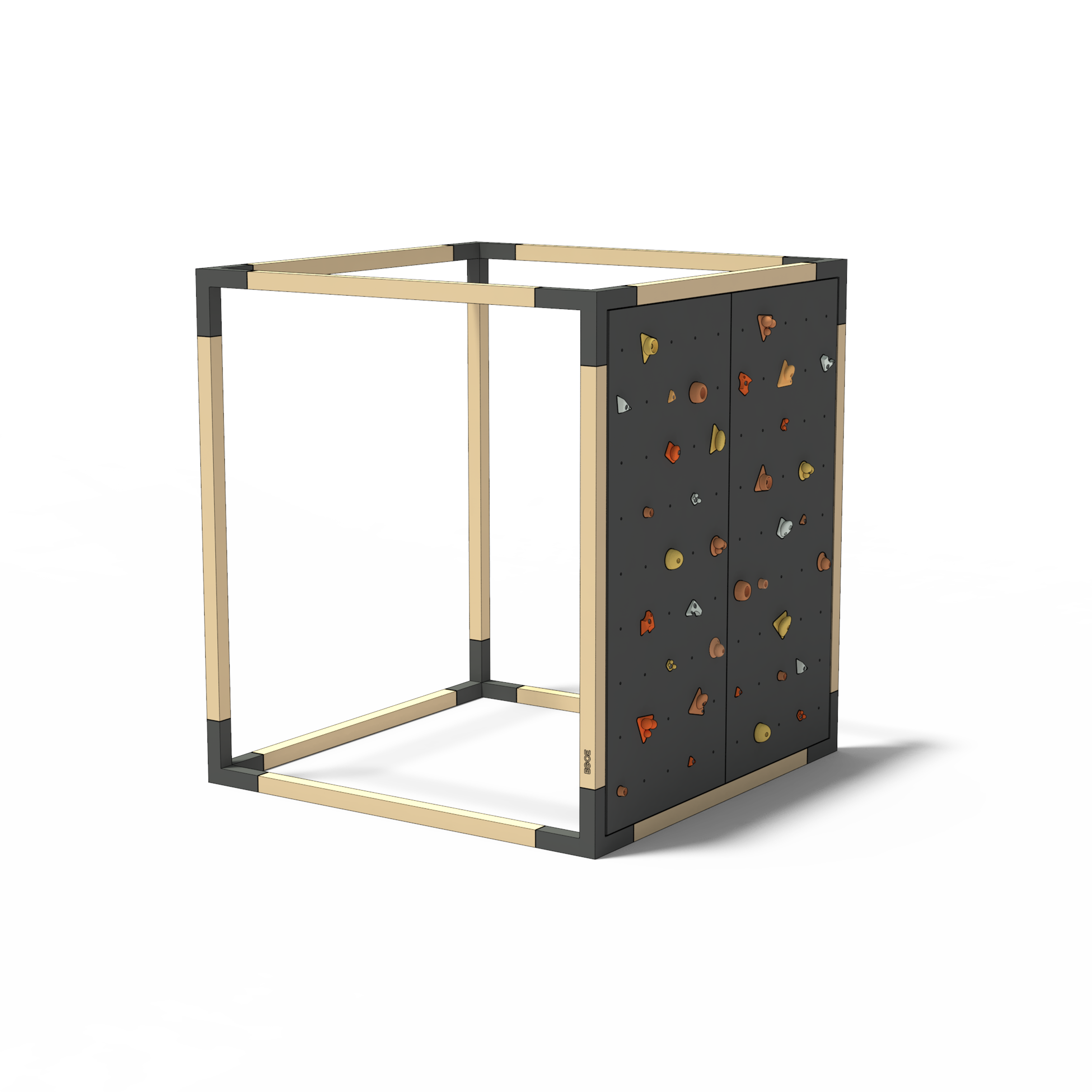 grid made of larch wood, treated with nano-coating of colourless oil, outdoor plywood, one side with board paint and pre-drilled holes for climbing holds (30pcs)