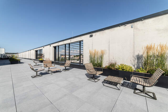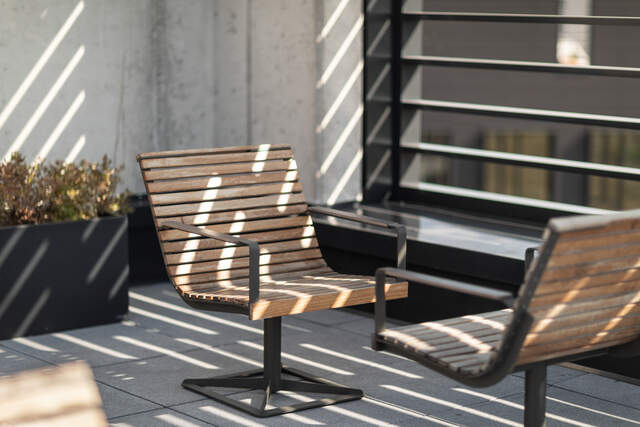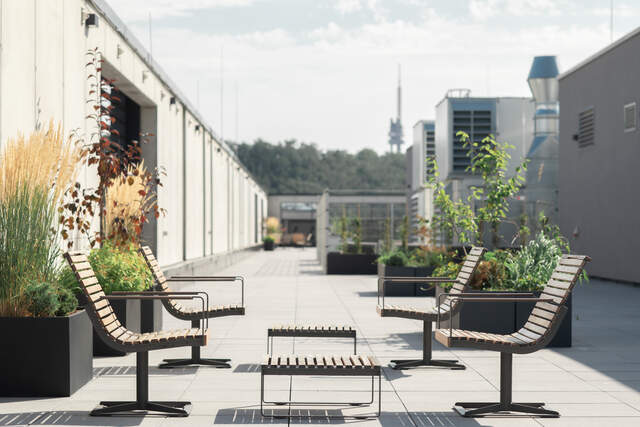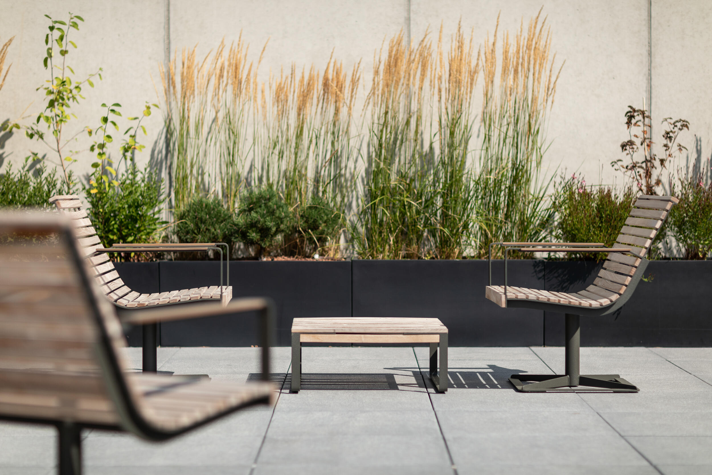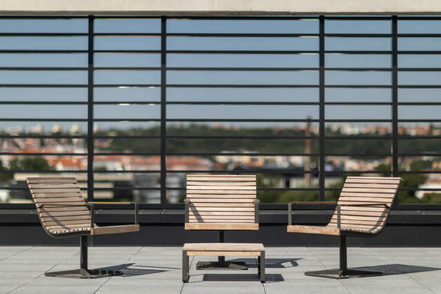Building the sample space also meant giving shape to the idea of a relaxation area on a large common terrace. To create a space of homogeneous design the architect opted for our Preva series furniture complemented with woody benches from our “elder sister” company, mmcité. Preva is modern, subdued and light, just like the architecture of the terrace. It echoes the prevailing horizontality of architectural elements, and the wood which visually dominates this furniture unobtrusively introduces nature into the structure of the space. The natural element is then accentuated by the grasses in outdoor planters. As a whole, it feels very peaceful and calm and invites you to sit down and take a rest. Preva is a furniture series of soft lines and generous proportions which is why it works well within the scale of the terrace. It is very durable and easy to maintain. Its shrewd and sophisticated design makes it furniture suitable for spaces with the highest quality requirements. At Rustonka we cooperated with Evžen Dub, an architect from CMC Architects studio.