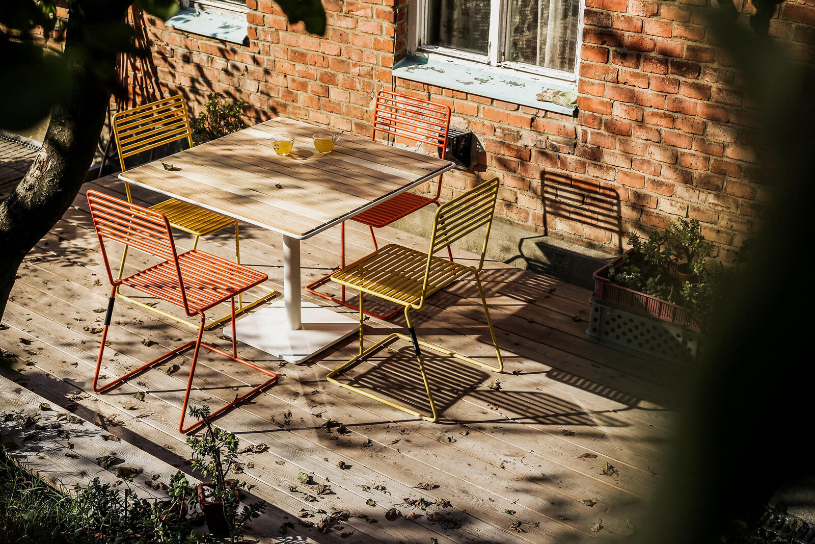 Are you looking for even more comfort? If so, you can go for a version with armrests and even add textile armrest cushions. The frame is made out of steel zinc-coated tubes with a powder coated finish. For the seat, you can choose from tropical wood, locust wood or steel rods material with an option to add an outdoor foam weaving.