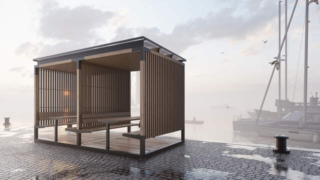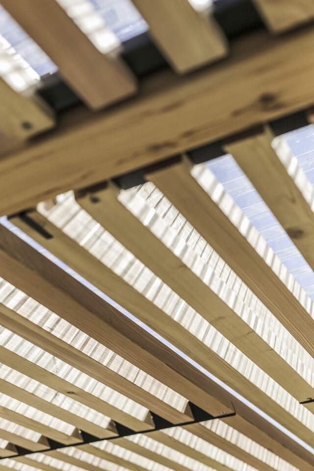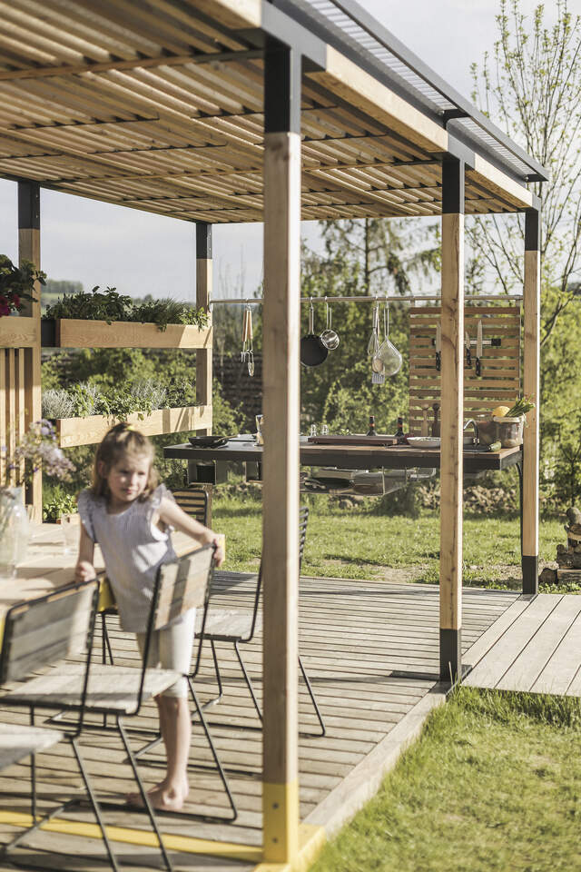 konstrukcja stalowa z zabezpieczeniem antykorozyjnym - powłoką cynkową i malowaniem proszkowym, deski i listwy modrzewiowe, poliwęglan. Drewno jest zabezpieczone nanopowłoką z bezbarwnego oleju.