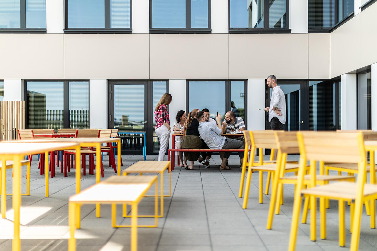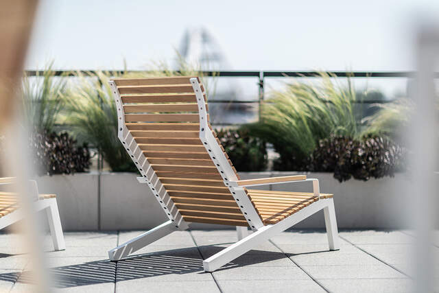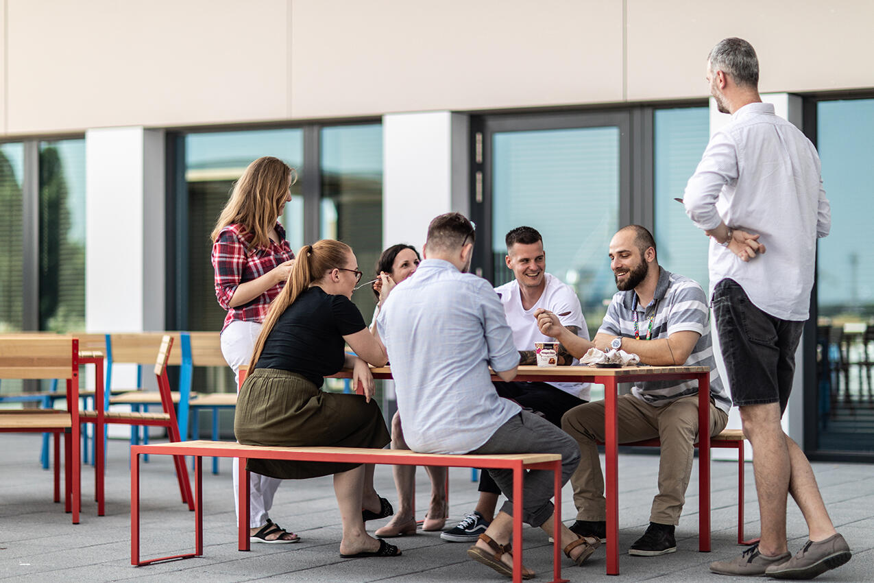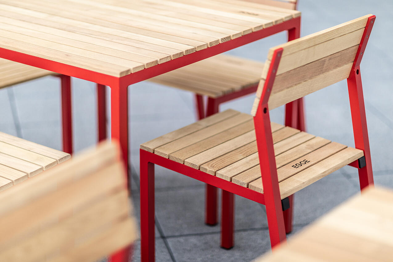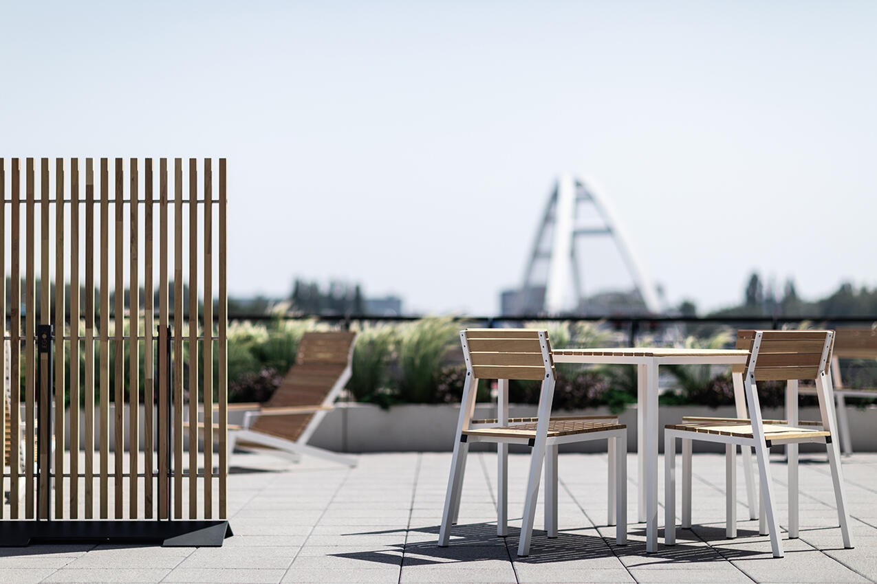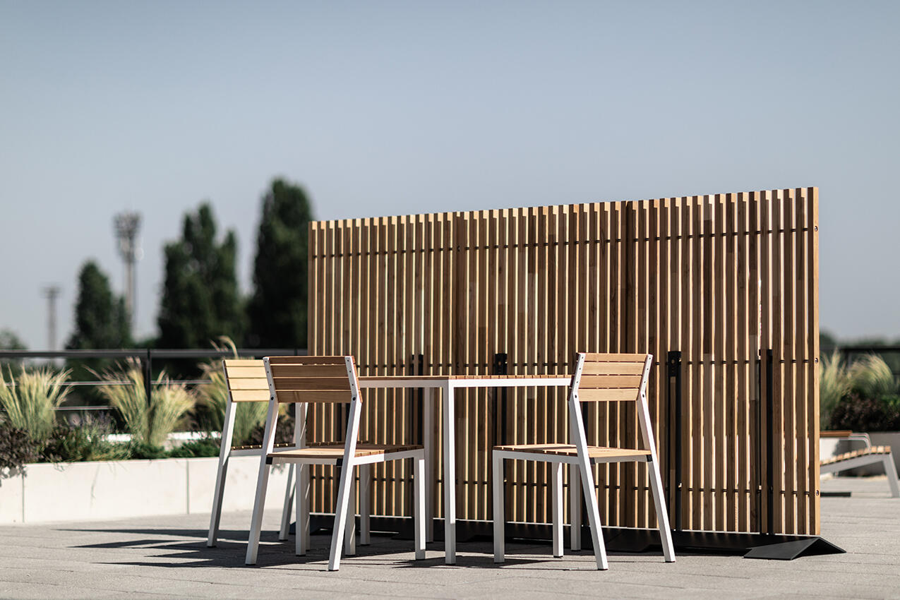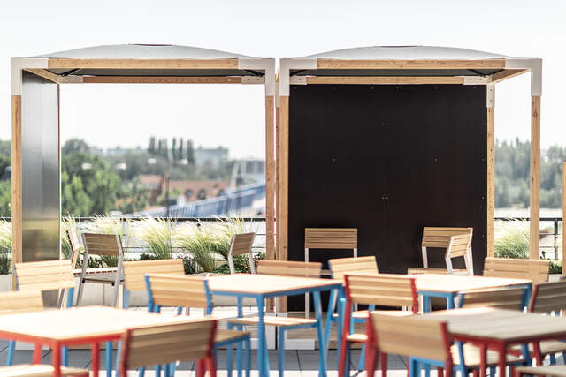 Kamieniem węgielnym całego projektu jest pięć sześcianów Leva z nieprzemakalnymi dachami i stałymi ściankami. Pierwotnie rozwijaliśmy Levę jako biuro ogrodowe. Miała umożliwić "białym kołnierzykom" pracę na świeżym powietrzu i w otwartej, inspirującej przestrzeni, przy jednoczesnym zachowaniu przytulności, prywatności i spokoju. Od chwili, gdy weszła do sprzedaży była już wykorzystana jako ogrodowy salon gier, sypialnia, salon albo stoisko wystawowe. Z radością stwierdzamy zarówno my jak i nasz klient, że jako biuro lub nieformalna sala konferencyjna działa równie dobrze, wreszcie zgodnie z planem. Sześciany Leva można dowolnie mieszać i zestawiać tak, by odpowiadały miejscowym warunkom i potrzebom użytkowników. W Bratysławie sześciany Leva są wyposażone w krzesła i stoły Cora, które wraz z ławkami i stołami Bistrot tworzą przyjemne i niekonwencjonalne środowisko pracy. Przestrzeń została dodatkowo w kilku miejscach podzielona parawanami Mario. Doszły do nas słuchy, że w takim środowisku pracuje się naprawdę inaczej.