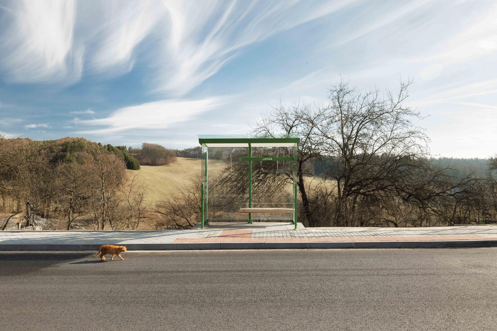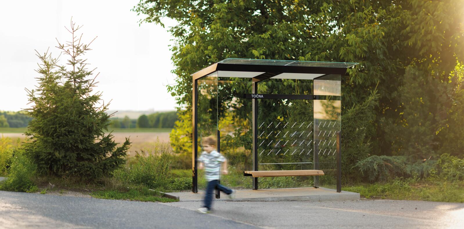 X2 - Wiata przystankowa rozpoznawalna na pierwszy rzut oka dzięki powtarzającemu się elementowi - nachyleniu pod kątem 45 stopni. Szklane tafle na dachu i po bokach mogą zawierać elementy graficzne.