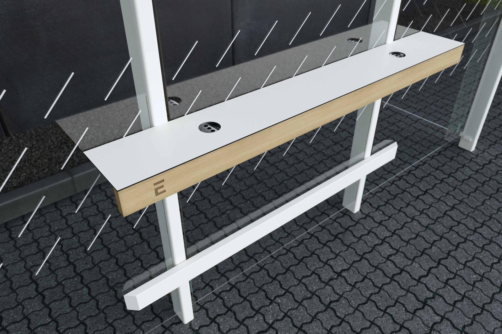 X2 - Wiata rowerowa dalej rozwija grę kątami -niepowtarzalny charakter całości jest wspierany przez nachylenie stojaków i załamaną dolną krawędź paneli bocznych. Ochrona przed warunkami atmosferycznymi jest wzmocniona przez dwustronny zwis dachu.